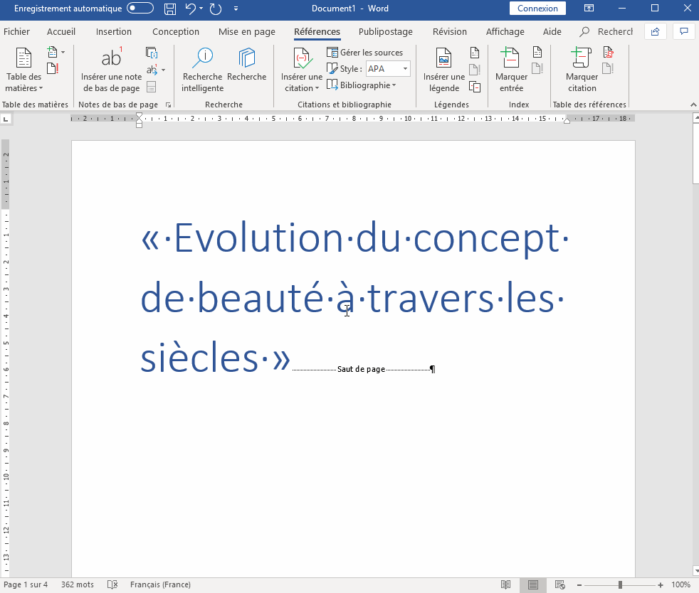 - Sur la page précédent votre page « Introduction », mettez votre curseur et faites Mise en page > Saut de page > Page suivante.